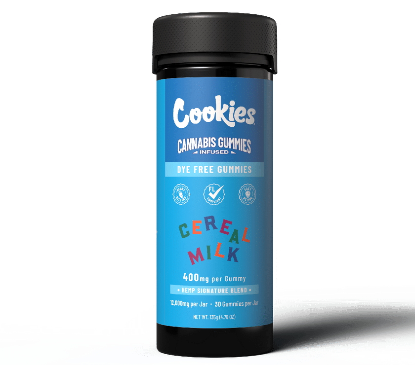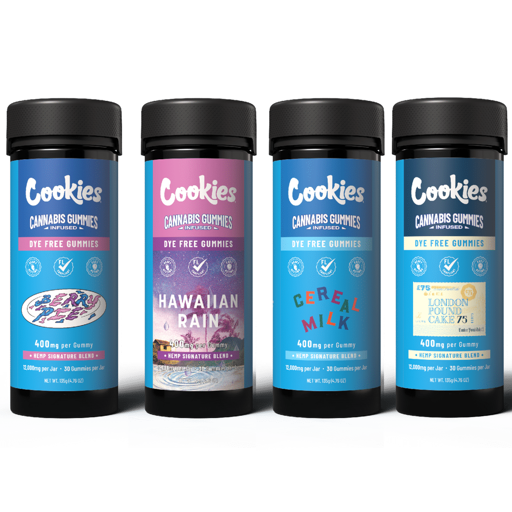Cookies Signature Blend Infused Gummies Jar features hemp-derived infused gummies in Berry Pie, Cereal Milk, Hawaiian Rain, and London Pound Cake flavors.