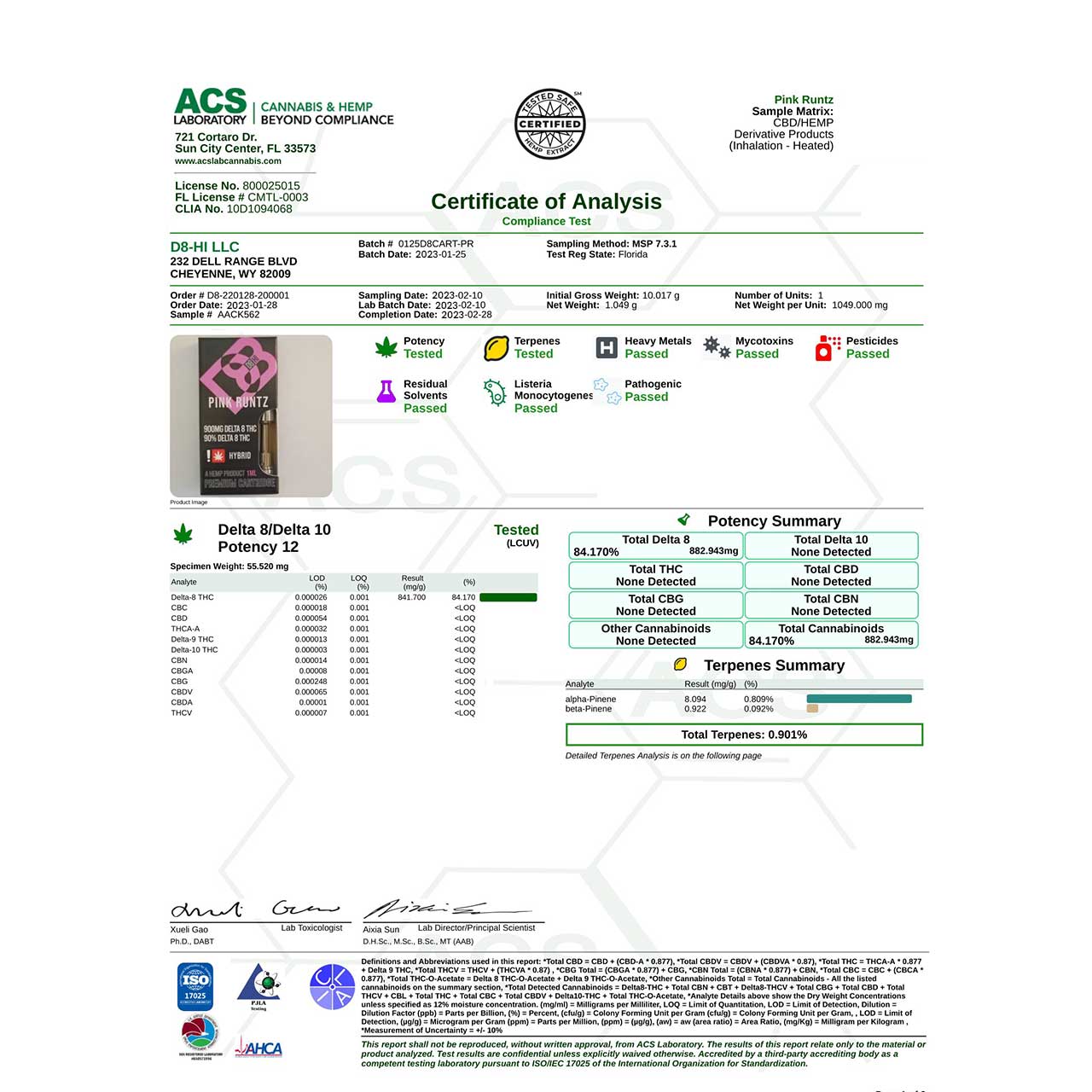 D8-HI Delta 8 Vape Cartridge | 1g – Pink Runtz